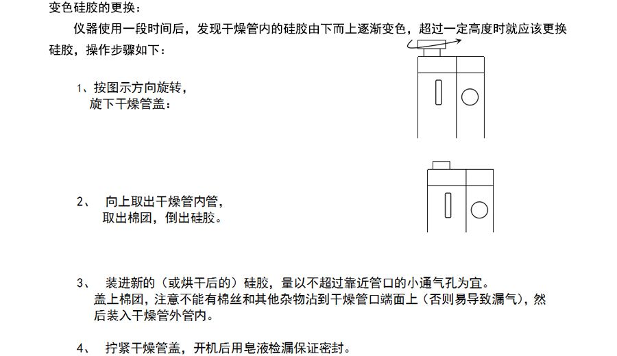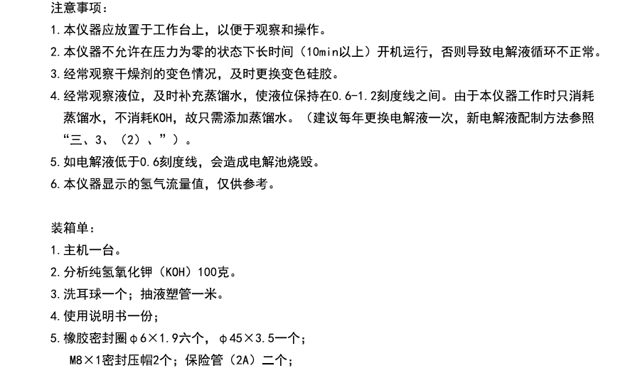 1、 主机一台。 2、 分析纯氢氧化钾(KOH)100克。 3、 洗耳球一个;抽液塑管一米。 4、 使用说明书一份; 5、 橡胶密封圈φ6×1.9六个,φ45×3.5一个; M8×1密封压帽2个;保险管(2A)二个;