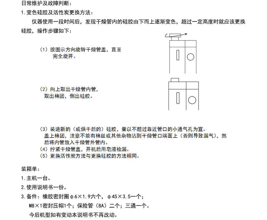 1、 主机一台。 2、 使用说明书一份。 3、 备件:橡胶密封圈φ6×1.9六个,φ45×3.5一个; M8×1密封压帽1个;保险管(8A)二个;三通一个。