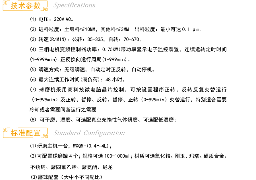 (2)可配置球磨罐4个;规格可选100-1000ml;材质可选氧化锆、刚玉、玛瑙、硬质合金、不锈钢、聚四氟乙烯、聚氨酯、尼龙