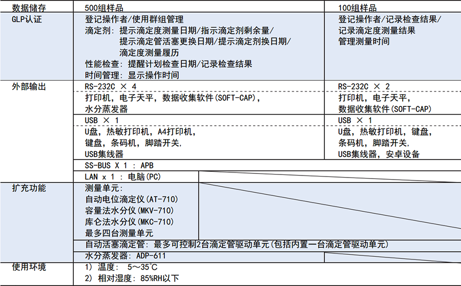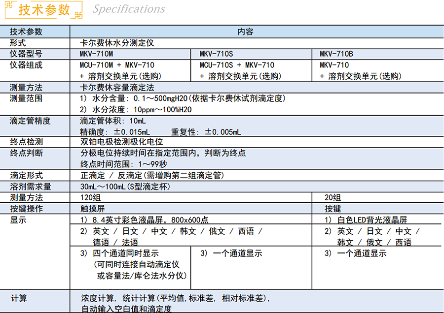 水分量:0.1-500mg H₂O(依据卡尔费休试剂滴定度),水分浓度10ppm-100%H₂O)