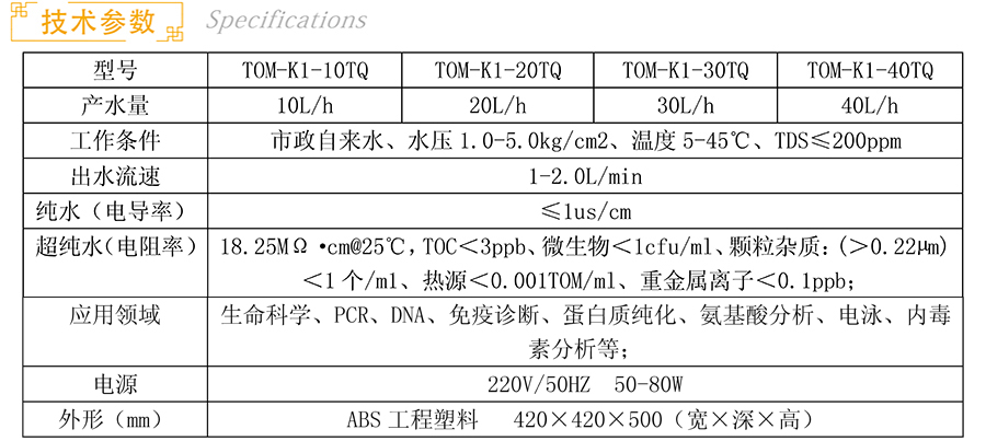 商品名称:美国TOMOS TOM-K1-T系列超纯水机 超强组合型 TOM-K1-20TQ 商品编号:10007172 上架时间:2017/12/25 0:00:00