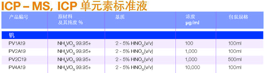 商品名称:爱尔兰Reagecon ICP-MS/ICP校准标准液 钒 商品编号:30000878 上架时间:2016/7/8 0:00:00
