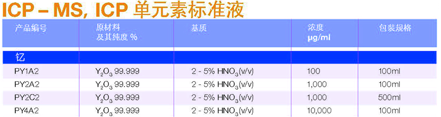 商品名称:爱尔兰Reagecon ICP-MS/ICP校准标准液 钇 商品编号:30000884 上架时间:2016/7/8 0:00:00