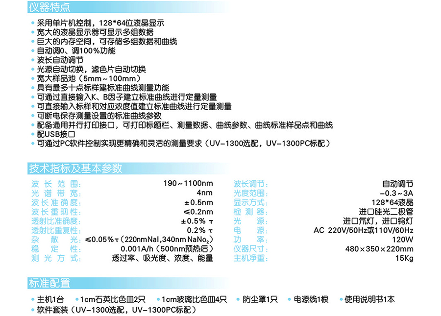 主机、1cm石英比色皿2只、1cm玻璃比色皿4只、防尘罩1只、电源器1根、使用说明书1本、软件套装