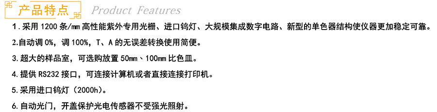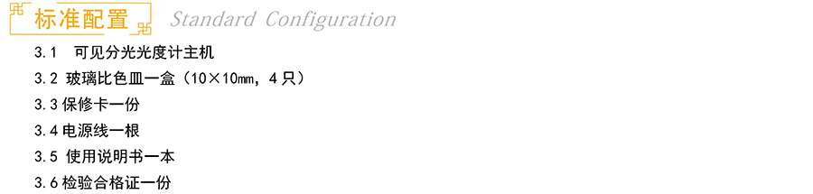 主机、 玻璃比色皿一盒(10×10mm,4只)、保修卡一份、电源线一根 、 使用说明书一本、检验合格证一份