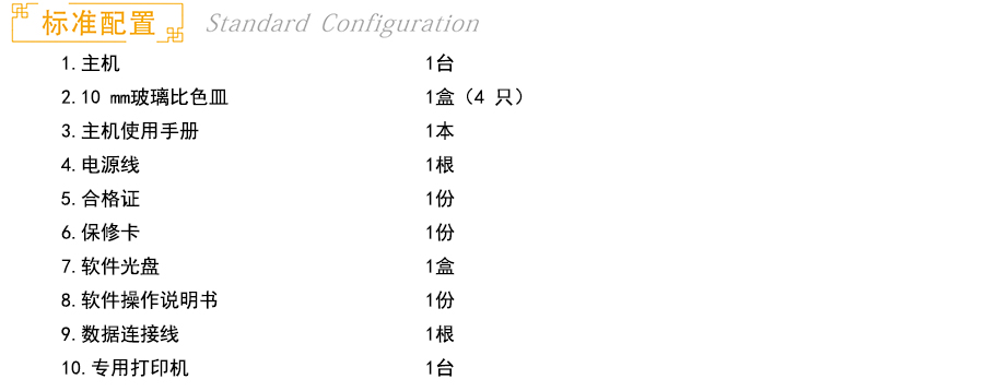 主机1台、10 mm玻璃比色皿1盒(4 只)、主机使用手册1 本、电源线1根、合格证1份、保修卡1份、软件光盘1盒、软件操作说明书1份、数据连接线1根、专用打印机1台