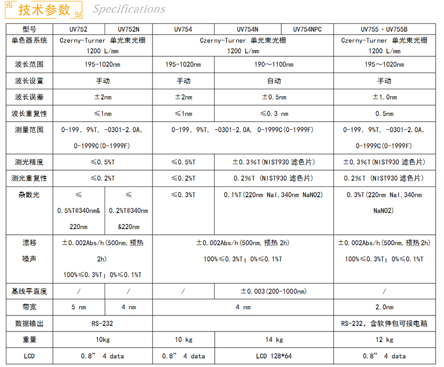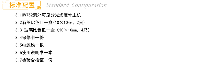 主机、石英比色皿一盒(10×10mm,2只)、玻璃比色皿一盒(10×10mm,4只)、保修卡一份、电源线一根、使用说明书一本、检验合格证一份