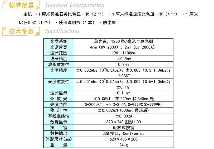 主机、1厘米玻璃比色皿一套(4个)、防尘罩、用户操作手册、1厘米比色皿架(1个)、1厘米石英比色皿一套(2个)