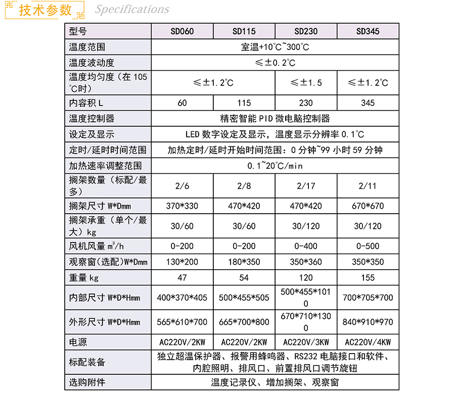 主机,独立超温保护器,报警用蜂鸣器,RS232电脑接口和软件,内腔照明,排风口,前置排风口调节旋钮