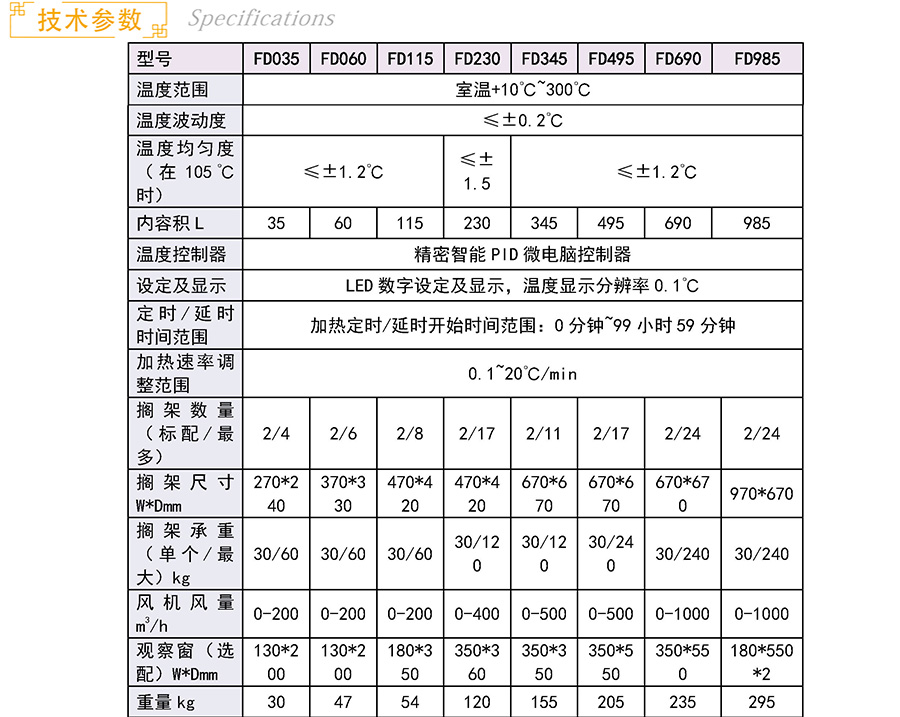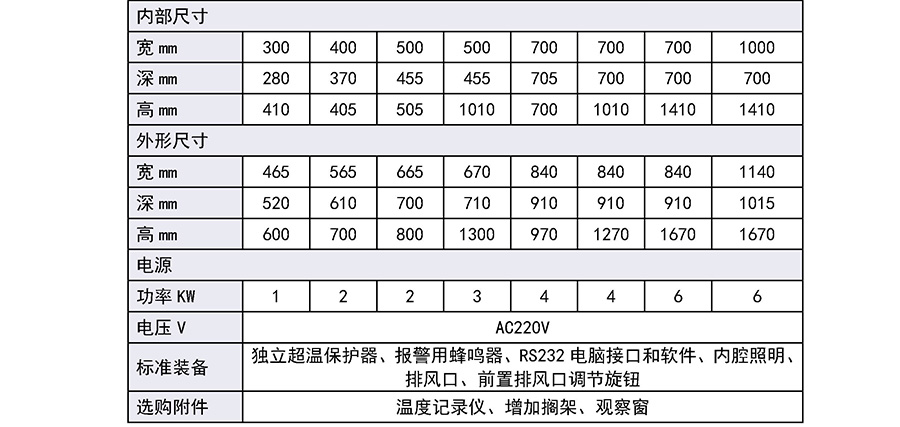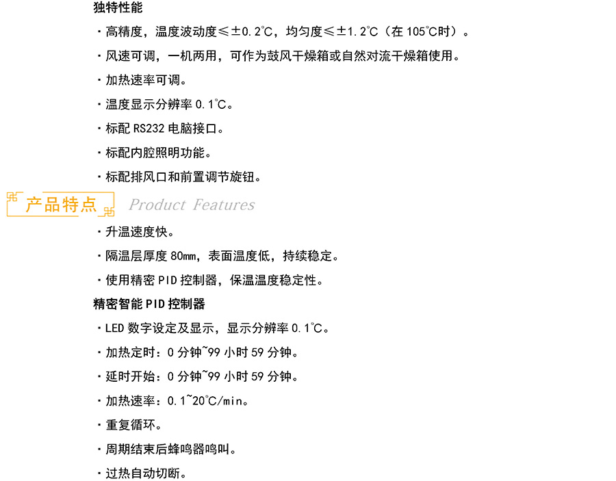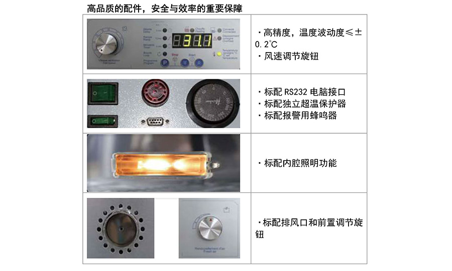 主机、独立超温保护器、报警用蜂鸣器、RS232电脑接口和软件、内腔照明、排风口、前置排风口调节旋钮