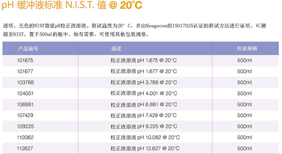 商品名称:爱尔兰Reagecon pH 缓冲液标准 N.I.S.T.(9.225)@20°C