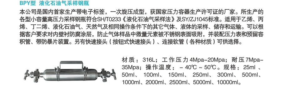 商品名称:抚顺博瑞特 BPY型液化石油气采样钢瓶 2500ml 商品编号:40017788 上架时间:2019/2/28 0:00:00