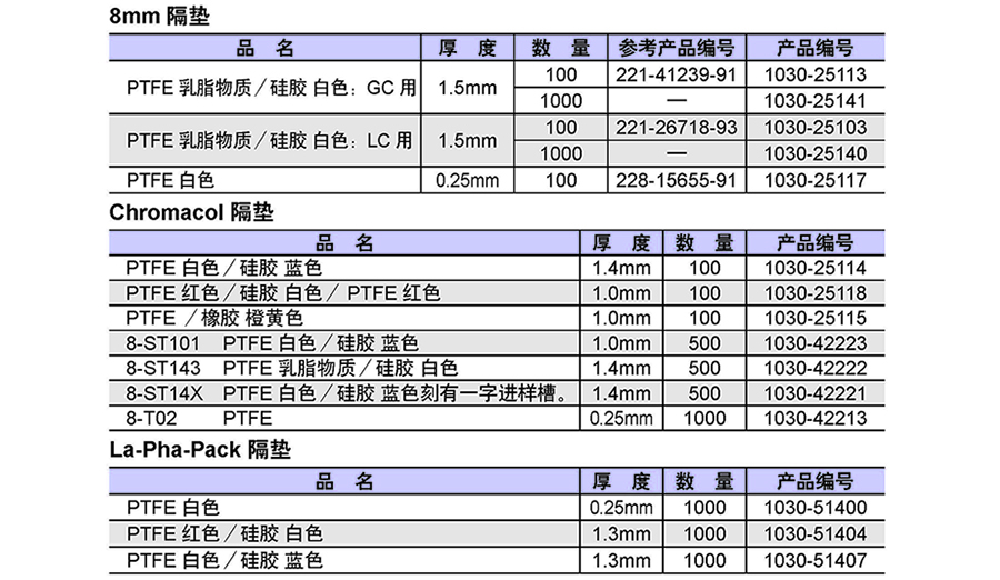 商品名称:上海岛津 12*32mm 标准口径(8-425) 螺旋样品瓶用隔垫 8mm PTFE乳脂物质/硅胶 白色 GC用 1.5mm厚 1030-25113 商品编号:40019171 上架时间:2019/7/19 0:00:00
