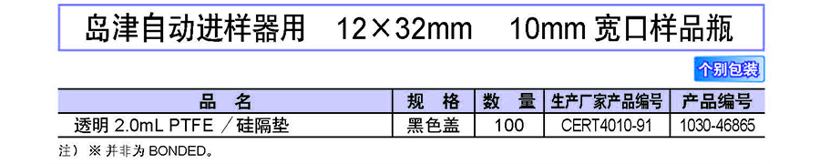 商品名称:上海岛津 自动进样器用 12*32mm 10mm 宽口样品瓶 透明 2.0ml PTFE/硅隔垫 黑色盖 1030-46865 商品编号:40019363 上架时间:2019/7/19 0:00:00