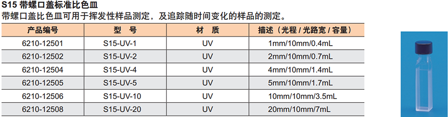 上海岛津 紫外可见分光光度计配件 S15带螺旋口盖标准比色皿 S15-UV-1 UV材质 光程1mm 光路宽10mm 容量0.4mL 6210-12501