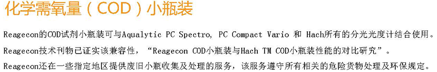 商品名称:爱尔兰Reagecon 化学需氧量(COD)小瓶装(0-1500mg/l)回收处理 商品编号:30001775 上架时间:2016/7/10 0:00:00