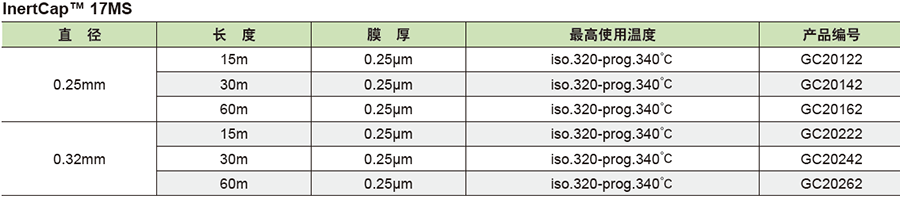 上海岛津 InertCap™ 17MS气相毛细管柱 直径:0.32mm,长度:15m,膜厚:0.25μm,产品编号:GC20222