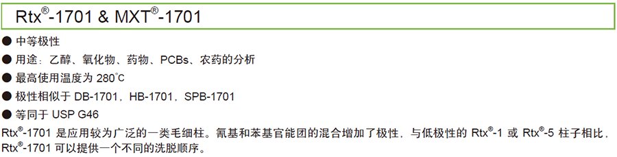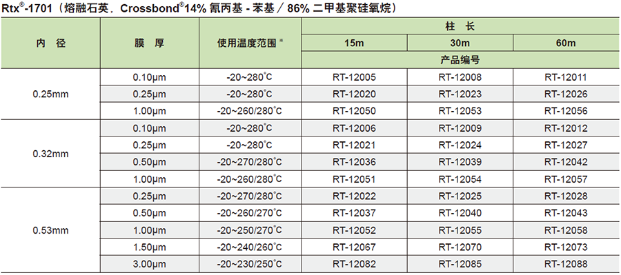 上海岛津 Rtx®-1701 气相色谱柱 内径:0.32mm,膜厚:1.00μm,柱长:15m,产品编号:RT-12051