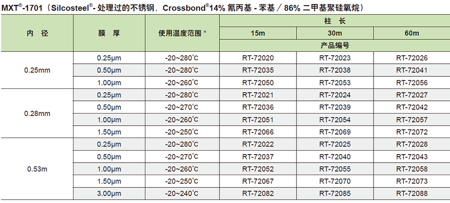 上海岛津 MXT®-1701 气相色谱柱 内径:0.25mm,膜厚:0.25μm,柱长:15m,产品编号:RT-72020