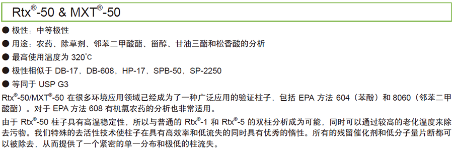 商品名称:上海岛津 MXT®-50 气相色谱柱 内径:0.18mm,膜厚:0.40μm,柱长:10m,产品编号:RT-71854 商品编号:40020778 上架时间:2019/7/19 0:00:00