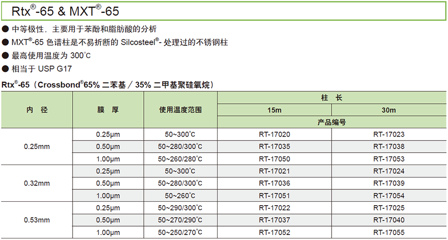 商品名称:上海岛津 Rtx®-65 气相色谱柱 内径:0.53mm,膜厚:0.50μm,柱长:30m,产品编号:RT-17040 商品编号:40020817 上架时间:2019/7/19 0:00:00