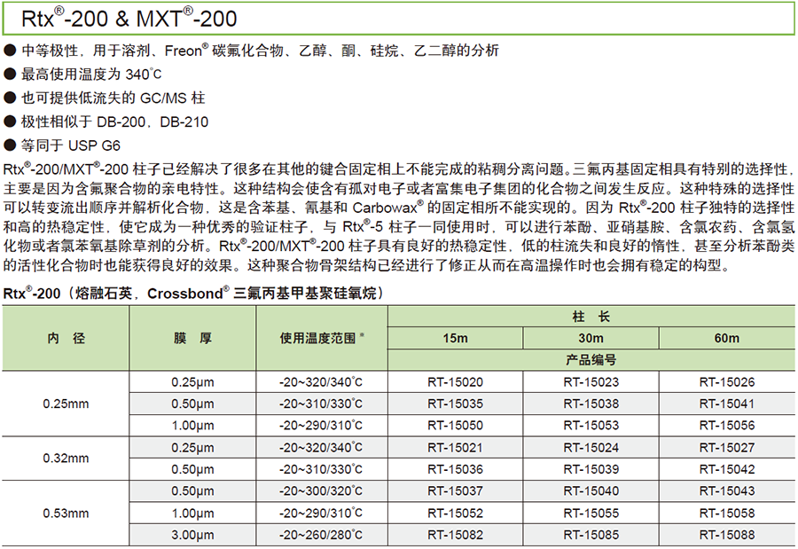 商品名称:上海岛津 Rtx®-200 气相色谱柱 内径:0.53mm,膜厚:1.00μm,柱长:30m,产品编号:RT-15055 商品编号:40020855 上架时间:2019/7/19 0:00:00