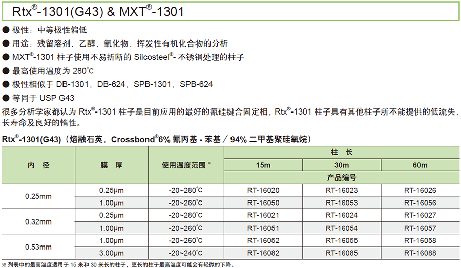上海岛津 Rtx®-1301(G43) 气相色谱柱 内径:0.25mm,膜厚:1.00μm,柱长:30m,产品编号:RT-16053