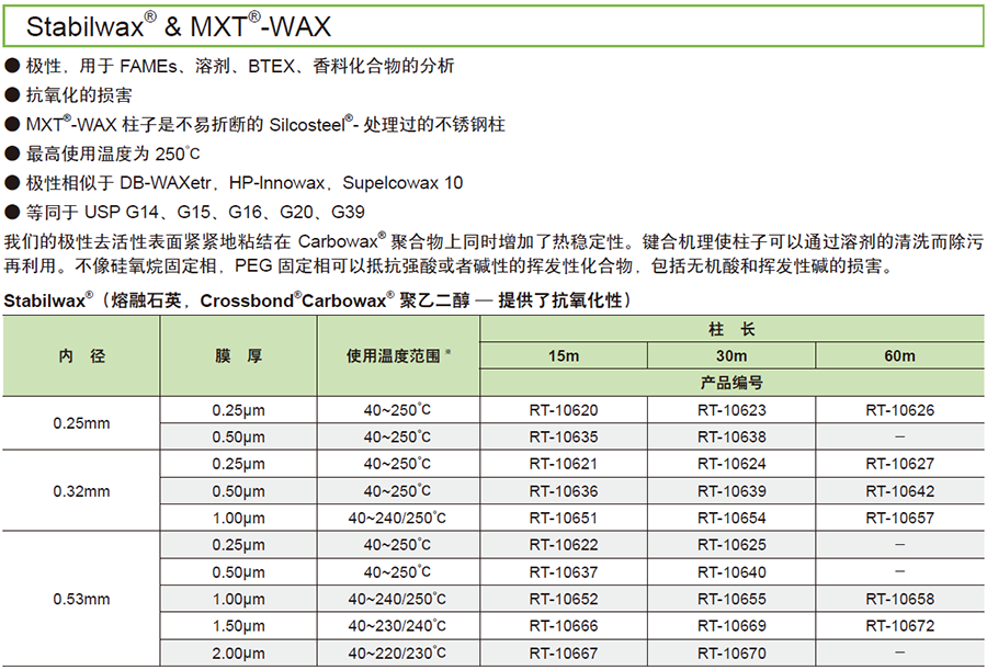 上海岛津 Stabilwax® 气相色谱柱 内径:0.53mm,膜厚:2.00μm,柱长:30m,产品编号:RT-10670