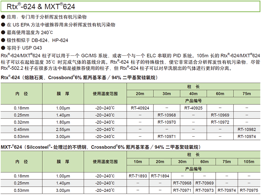上海岛津 MXT-®624 气相色谱柱 内径:0.53mm,膜厚:3.00μm,柱长:60m,产品编号:RT-70973