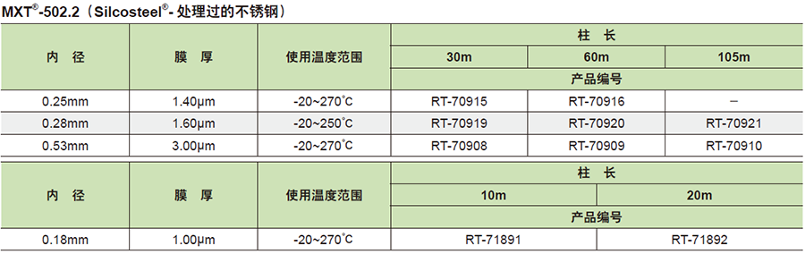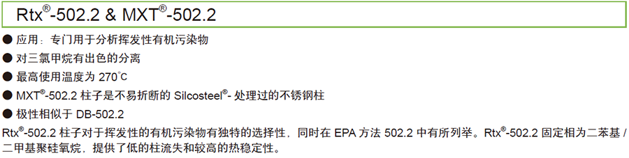 上海岛津 MXT®-502.2 气相色谱柱(Silcosteel®-处理过的不锈钢) 内径:0.25mm,膜厚:1.40μm,柱长:30m,产品编号:RT-70915
