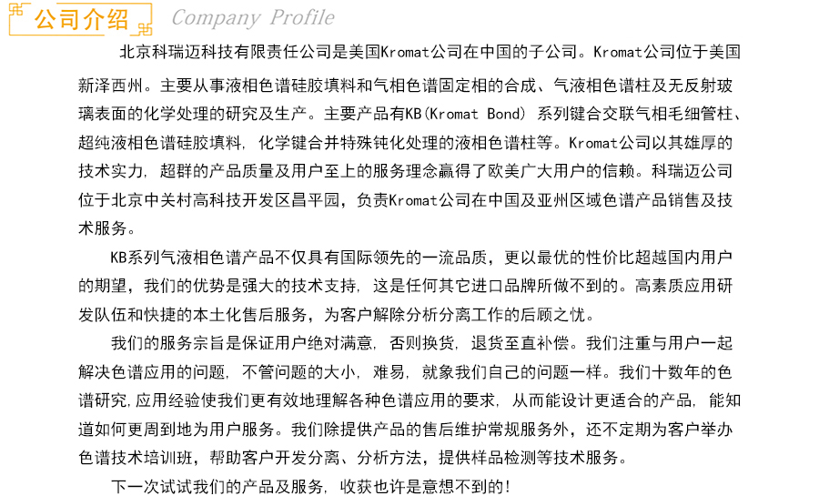 商品名称:科瑞迈Kromat PC-1色谱柱 30m×0.25mm×0.25um 100%二甲基聚硅氧烷