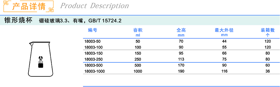 商品名称:博美玻璃 锥形烧杯 硼硅玻璃 有嘴 250ml