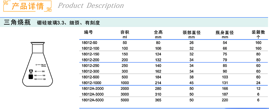商品名称:博美玻璃 三角瓶 三角烧瓶 硼硅玻璃 细颈 300ml
