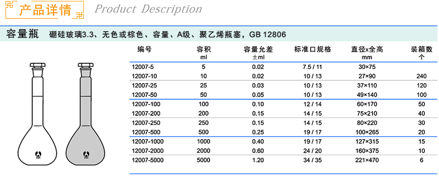 商品名称:博美玻璃 容量瓶 硼硅玻璃 A级 具塞 100ml