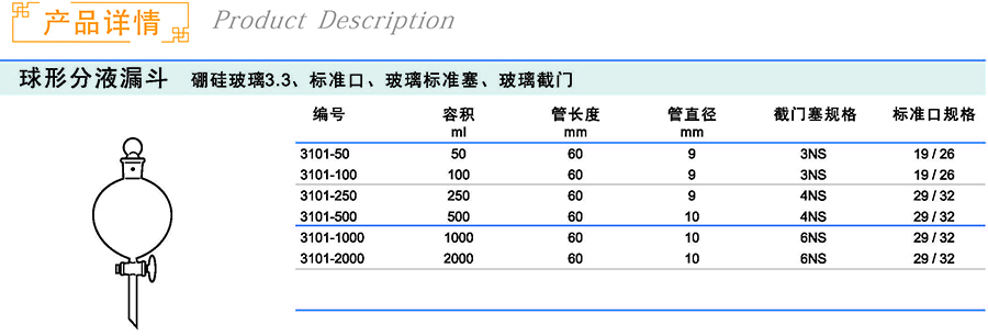 商品名称:博美玻璃 球形分液漏斗 硅硼玻璃 玻璃塞 聚四氟截门 1000ml