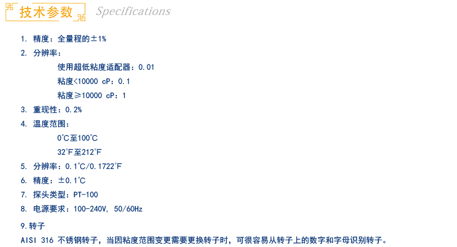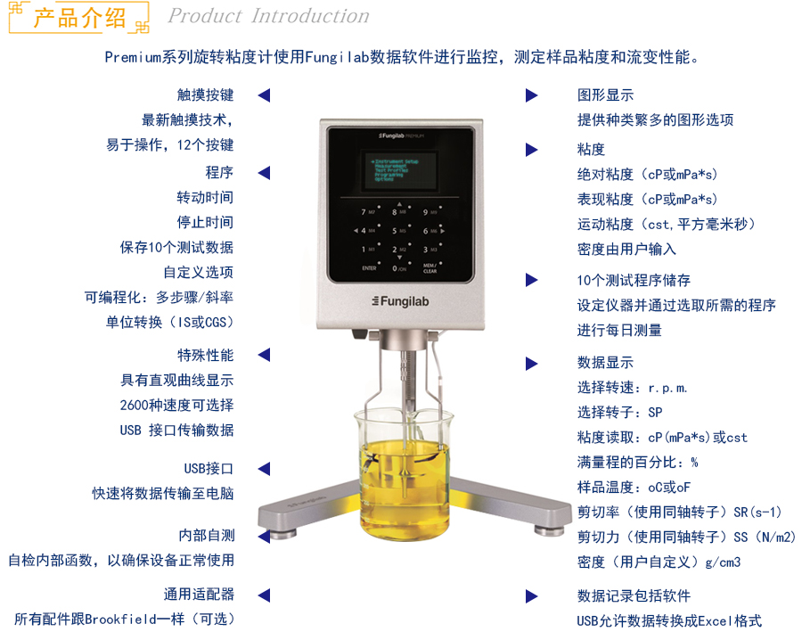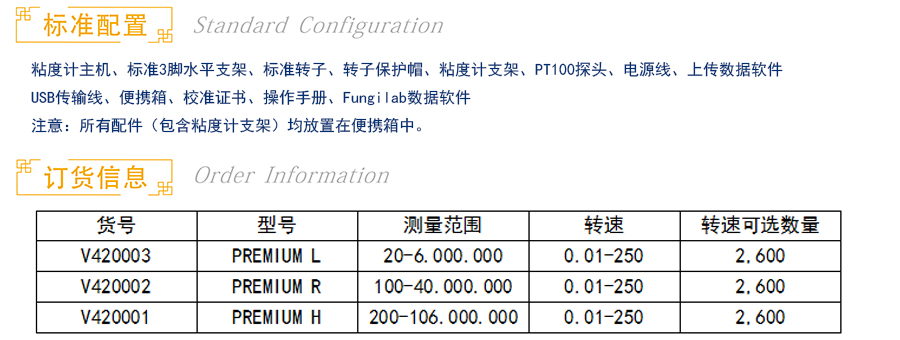 粘度计主机,标准3脚水平支架,标准转子,转子保护帽,粘度计支架,PT100探头,电源线,上传数据软件,USB传输线,便携箱,校准证书,操作手册,Fungilab数据软件, 注意:所有配件(包含粘度计支架)均放置在便携箱中。