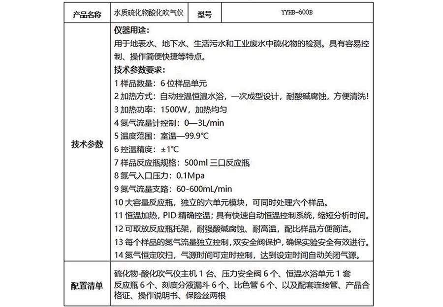 硫化物-酸化吹气仪主机1台、压力安全阀6个、恒温水浴单元1套、反应瓶6个、刻度分液漏斗6个、比色管6个以及配套连接管、产品合格证、操作说明书、保险丝2根