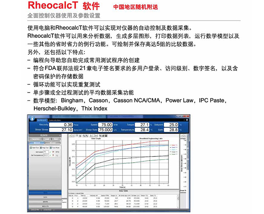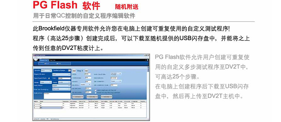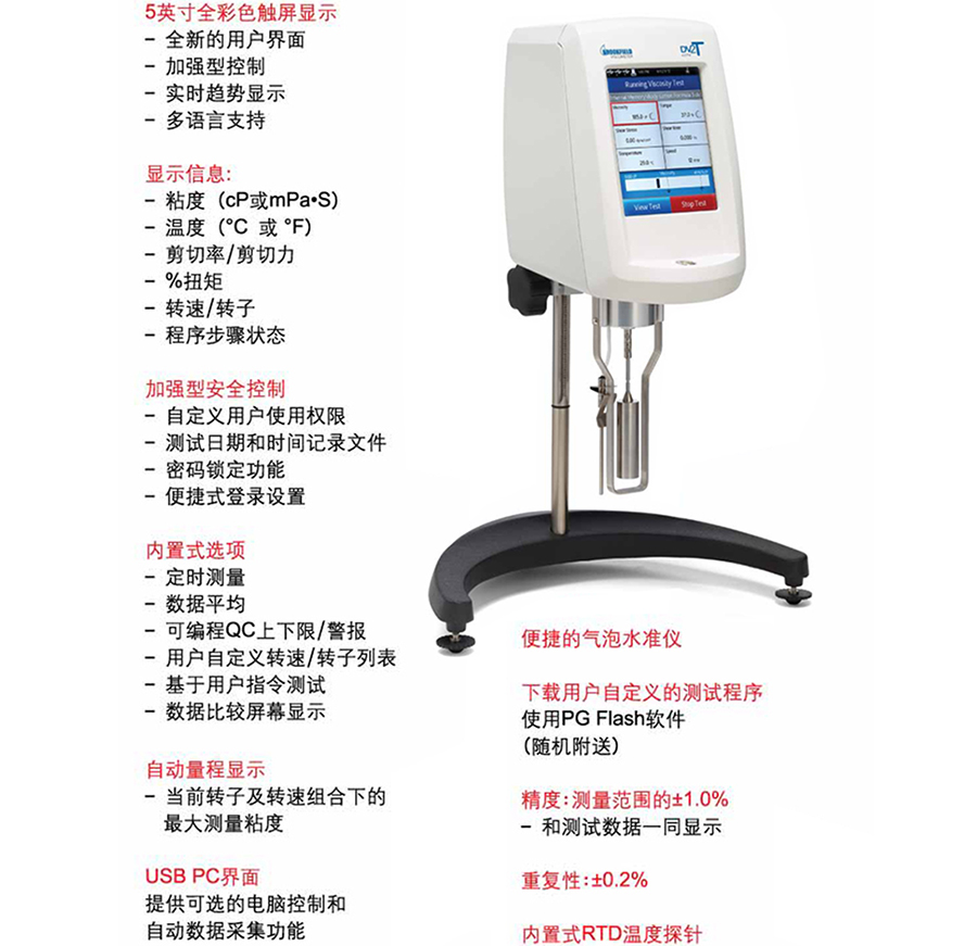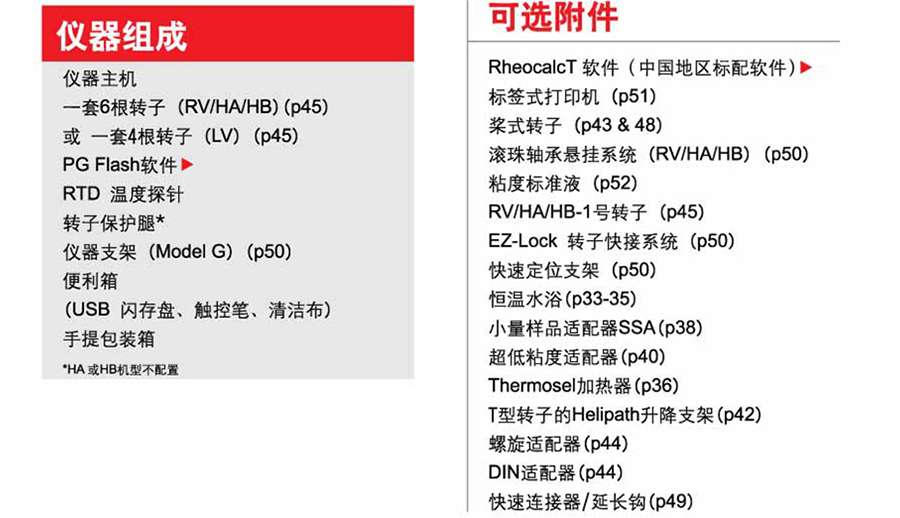 仪器主机、一套6根转子(RV/HA/HB)(p45)或一套4根转子(LV)(p45)、PG Flash软件、RTD温度探针、转自保护腿、仪器支架(Model G)(p50)、便利箱(USB 闪存盘 触控笔 清洁布)、手提包装箱