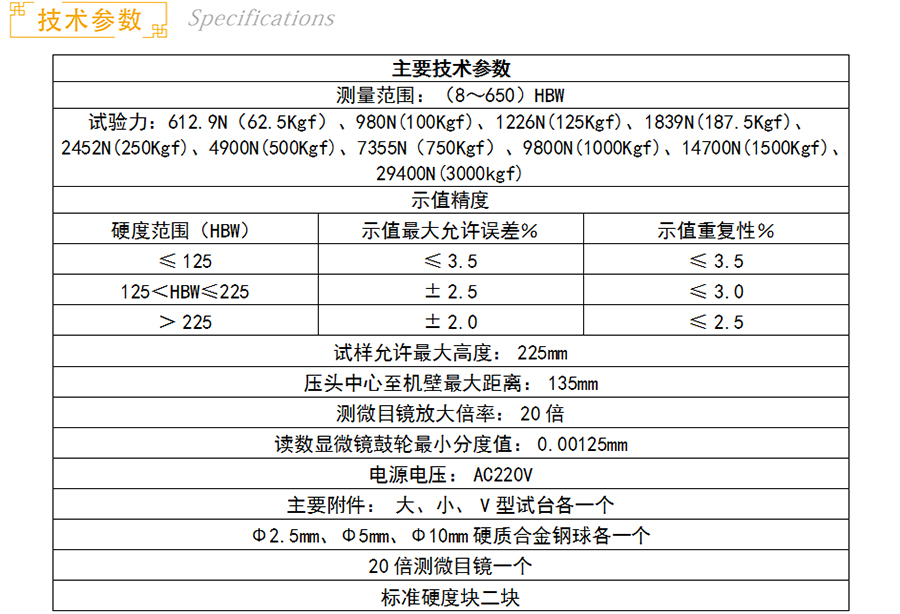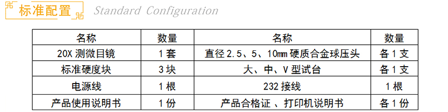 20X测微目镜 1套 直径2.5、5、10mm硬质合金球压头 各1支 标准硬度块 3块 大、中、V型试台 各1支 电源线 1根 232接线 1根 产品使用说明书 1份 产品合格证 、打印机说明书 各1份