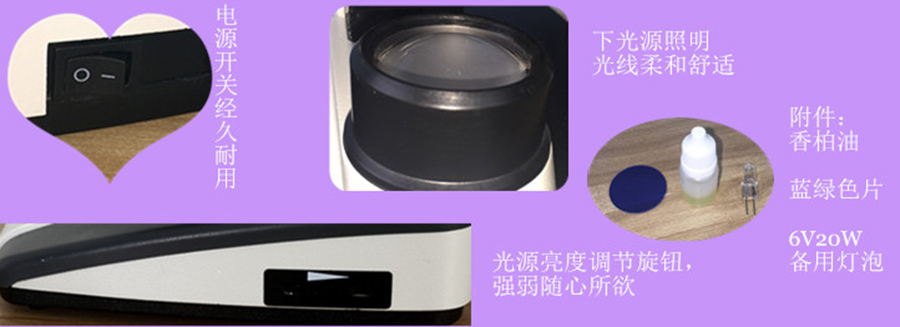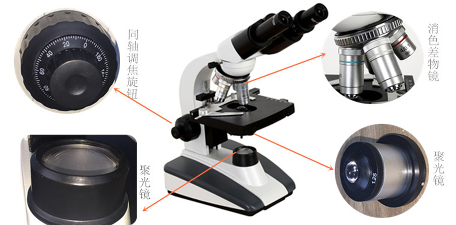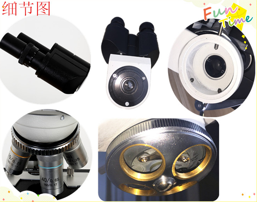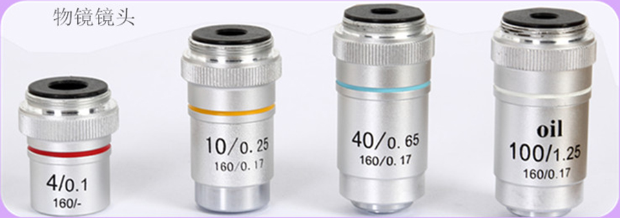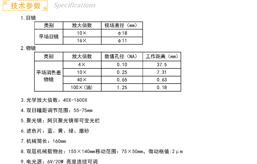 1.显微镜主体 1台 2.消色差物镜4×,10×,40×,100×油 各 1只 3.双目镜筒 1只 4.10×,12.5×平场目镜 各 1对 5.滤色片(蓝、黄、绿、磨砂) 各 1片 6.物镜用浸油(合成油) l瓶 7.备用卤素灯 1只