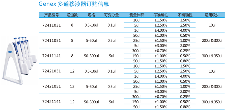 商品名称:宝予德 Genex手动8道可调量程移液器(半支消毒)容量5-50ul
