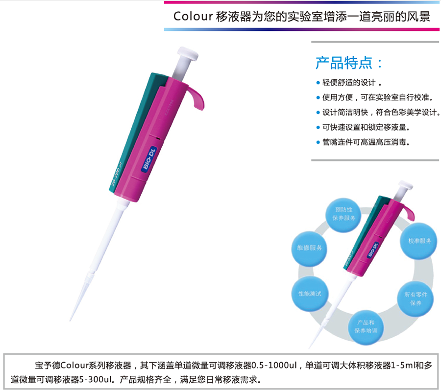 商品名称:宝予德 Colour彩色手动单道可调量程移液器(半支消毒)容量0.5-10ul